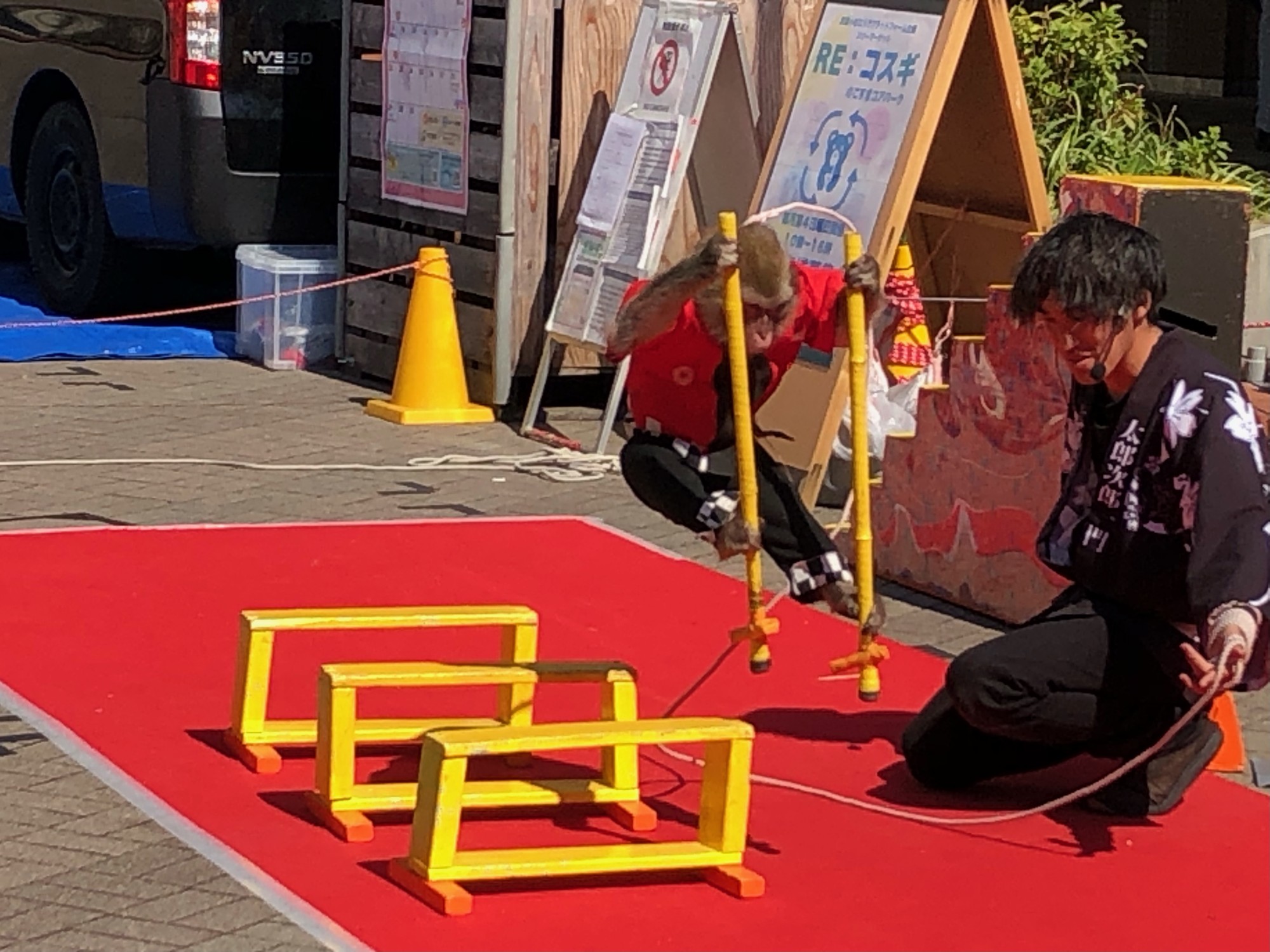 仏教の伝来と共に日本に渡ってきた「猿まわしの芸」は、日本最古の大道芸とされる伝統芸能で、かつては厄払いの祈祷として行われてきました。牧場では、「ゆうやと和(なごみ:猿)」のコンビでニホンザルによる竹馬やハードルジャンプ、高竹(通常より長い竹馬に乗る技)等の芸を披露予定です。