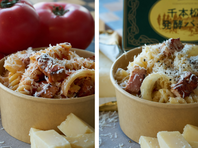 市内農家から仕入れた規格外のトマトを活用し、素材本来の味わいを大切にしたソースが特長の「アマトリチャーナ(ベーコンと玉ねぎのトマトソース)750円」と、千本松の発酵バターをソースに使用した「グリーチャ(ベーコンと玉ねぎのバターソース)700円」を販売します。