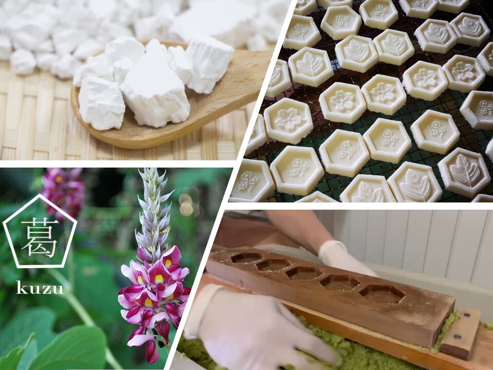 恵夢経恵寿の葛湯は、吉野本葛、ビートグラニュー糖、和三盆などを混ぜ合わせた、懐かしく優しい味わいです。日本伝統の木枠に詰めて型取りする、今では珍しい製法を守っています。当社は以前、仕入れ販売の会社でしたが、後継者がいない職人さんから製法と技術を事業承継して製造販売をするようになりました。製造は、その日の天気や湿度に左右されます。自然の中に身をおいて五感を研ぎ澄まし、季節や状況の変化を繊細に感じ取ることが大切だと学びました。日々試行錯誤し、常に技術向上を心がけています。