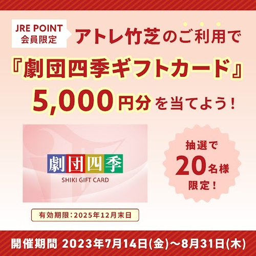 期間中、JRE POINT WEBサイトからエントリーの上アトレ竹芝で合計5,000円(税込)以上お買上いただいた方にJR東日本四季劇場[春][秋]または自由劇場(東京・竹芝)で上演する劇団四季公演の観劇チケットが購入できる『劇団四季ギフトカード』(5,000円分)を抽選で20名様にプレゼント!