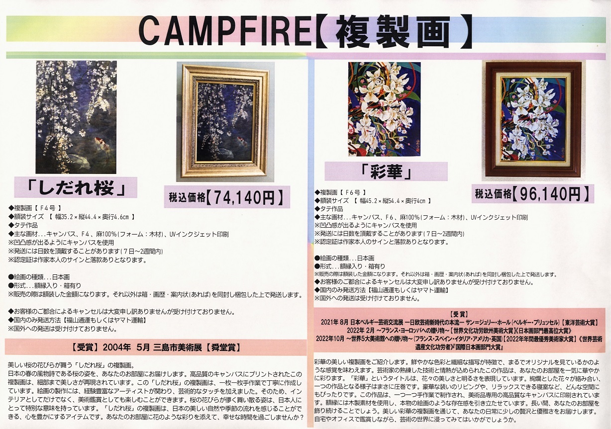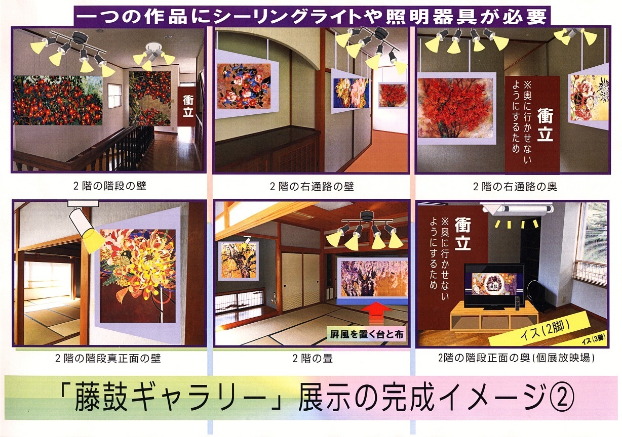 リフォーム後の藤鼓ギャラリーにて展示会を開催したのちには、日本画家 加藤 由利子の作品の常備品も兼ねて、地元・地域の活性化・まちづくりの発展や発信を行ってまいります。