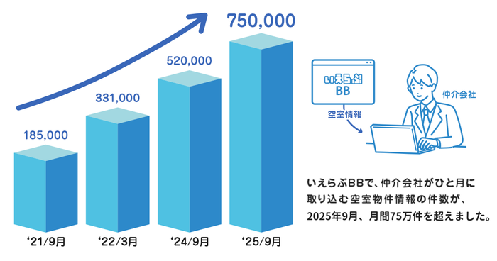 このたび2025年9月、「いえらぶBB」の物件取込み数が月間75万件を突破いたしました。2022年3月時点の33万件から大幅に増加し、過去最高の取込件数となります。