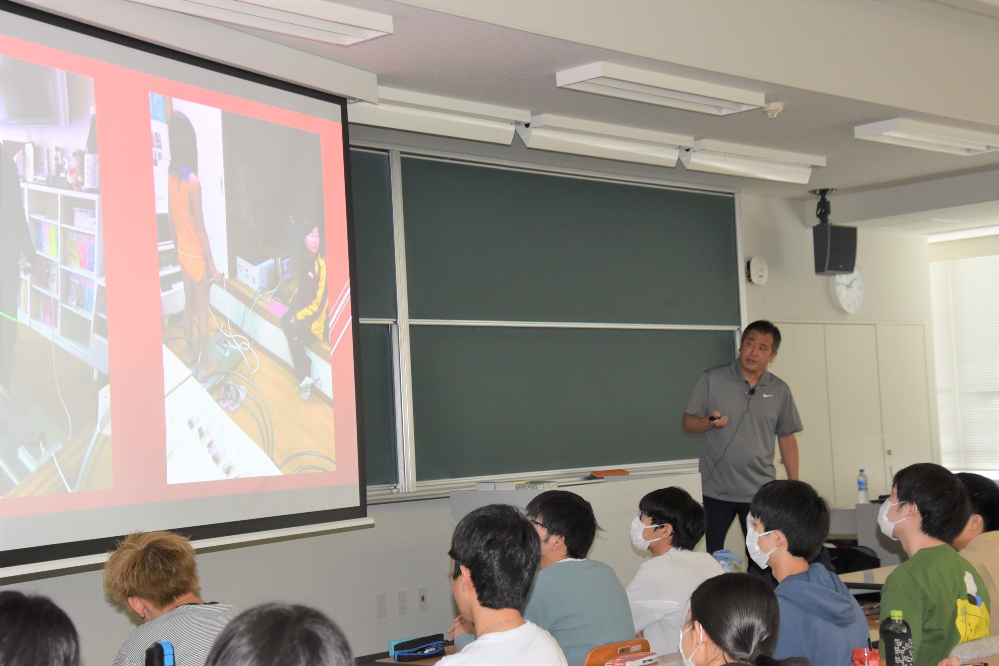 本学女子駅伝部監督で法学部の米田勝朗教授が5月16日、八事キャンパスで薬学部の梅田孝教授が担当する1年次開講科目「健康・スポーツ科学理論」のゲスト講師として登壇し、3、4限の2コマ合わせて266人の学生を前に、「大学女子駅伝日本一への挑戦」と題して、1995年の創部以来の指導方針や強化方法の変遷、指導者としての思いなどを振り返りながら、入学間もない学生たちに貴重なアドバイスを送りました。