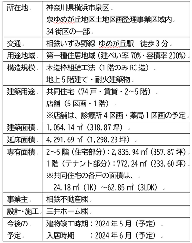 相鉄グループの相鉄不動産㈱(本社・神奈川県横浜市西区、社長・左藤 誠)は、「大規模集客施設」(2024年夏開業予定)を建設中の相鉄いずみ野線ゆめが丘駅前に、木造賃貸マンションを含む「(仮称)相鉄・小菅ゆめが丘共同ビル計画」(神奈川県横浜市泉区・以下、本計画)を着工しました。本計画は、木造建築(1階は鉄筋コンクリート〔RC〕造、2~5階は木造)で、1階に複数の診療所の開業を予定しているため、木造医院建築実績No.1(※3)でもある三井ホーム㈱(本社・東京都新宿区、社長・池田 明)が設計・施工を行います。なお、本計画は、国土交通省が木造建造物の振興施策として進めている「優良木造建築物等整備推進事業」(以下、「優良木造事業」)の採択事業(令和4年度第Ⅱ期募集)です。
