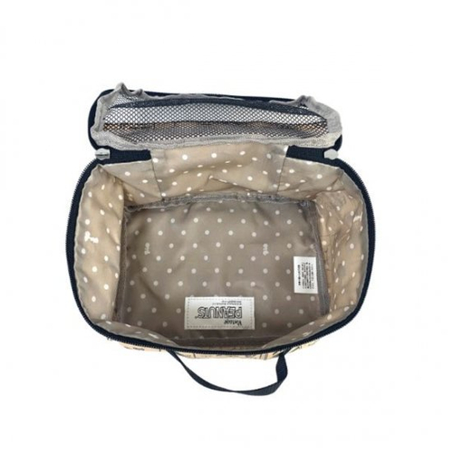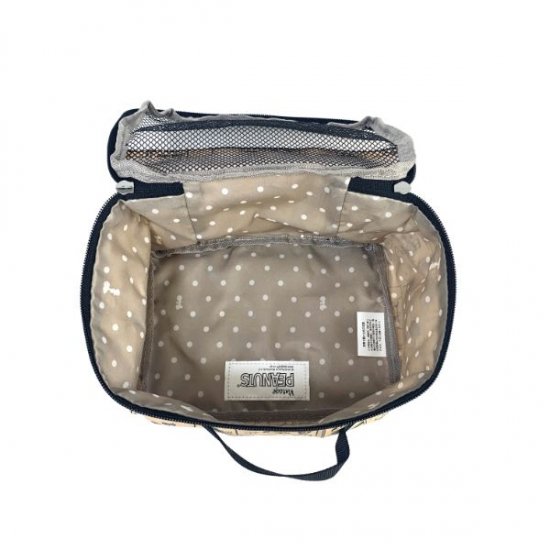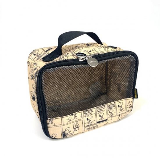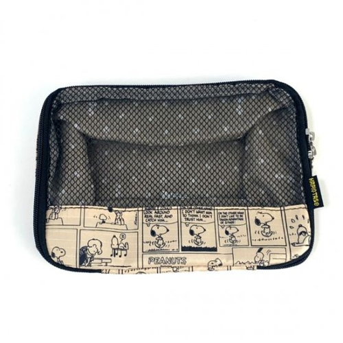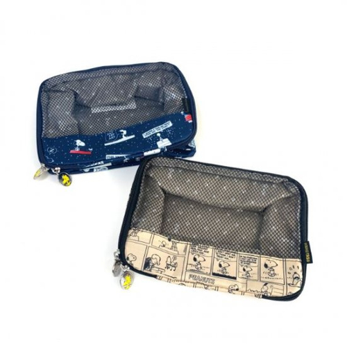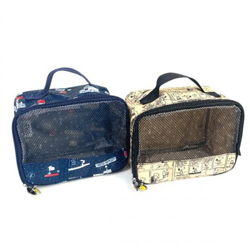 こちらが今回ご紹介するスヌーピーオーガナイザーです。前面がメッシュ素材なので中身が見えて便利、そのうえ通気性もバッチリ◎衣類を入れたりスキンケアや小物をまとめたりスーツケースのなかをスッキリさせてくれます。
