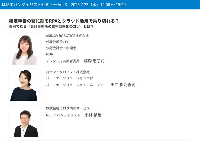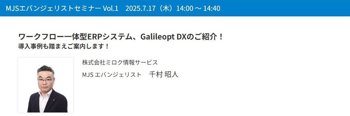 また、スペシャルセミナーVol.1には、社会学者/作家の古市 憲寿氏をお招きし、「停滞を突破するDXの力 古市憲寿と見いだす、中小企業再成長のシナリオ」と題しご講演をいただくほか、MJSエバンジェリストや協賛企業さまによる実践的なノウハウを学べるライブセミナーを期間中の毎日(土日祝日を除く)開催し、財務会計から人事、販売管理、セキュリティ対策まで業務課題を解決するための実践的なノウハウをお伝えします。