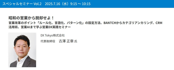 昭和型の属人的営業から脱却し、再現性ある営業組織への転換を目指すセミナーです。上場企業で全国1位を3年連続で獲得した元トップセールスが、コンサルタントとして「営業は技術である」ことを体系的に解説します。「ルール化・言語化・パターン化」を軸にBANTCHやカテゴリアンカリング、CRM・SFAの実践活用、さらに最新の営業AIまでを幅広く紹介します。営業未経験者でも成果を出せる仕組みを作りたい方、営業改革を進めたい経営層やマネージャーに最適なセミナーです。