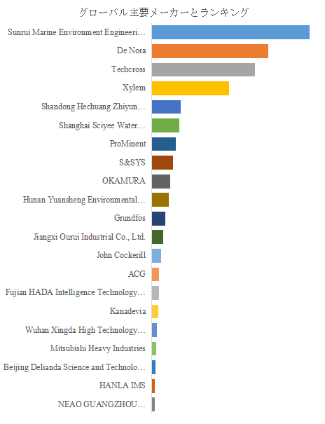 LP Informationのトップ企業研究センターによると、電気塩素消毒システムの世界的な主要製造業者には、 Sunrui Marine Environment Engineering Co., Ltd.、De Nora、Techcross、Xylem、Shandong Hechuang Zhiyun Environmental Protection Equipment Co., Ltd.、Shanghai Sciyee Water Science&Technology Co., Ltd.、S&SYS、ProMinent、OKAMURA、Hunan Yuansheng Environmental Protection Equipment Co., Ltd.などが含まれている。2024年、世界のトップ10企業は売上の観点から約67.0%の市場シェアを持っていた。特にSunrui Marine Environmentは、海洋バラスト処理分野で圧倒的なシェアを有し、国際規制に適合した高効率電解技術でリーダーシップを発揮している。De Noraは長年の電極技術開発を背景に、水処理・発電・化学産業など複数分野に横断的なソリューションを提供している。一方、Techcrossは高効率モジュール構造による装置小型化を実現し、船舶・プラント市場で競争力を高めている。日本ではOKAMURAや三菱重工業が防衛・発電分野向けに信頼性の高いシステムを提供しており、韓国のS&SYS、HANLA IMSなども海洋系分野でのプレゼンスを拡大している。また、近年は中国勢の台頭が顕著であり、Shandong Hechuang ZhiyunやHunan Yuansheng Environmentalなどが価格競争力と地域ネットワークを武器に市場シェアを拡大している。電極材料の改良や自動制御技術の導入、AIを活用した濃度モニタリングシステムの開発が進み、製品性能の差別化と長期運用コストの低減が市場競争の焦点となっている。