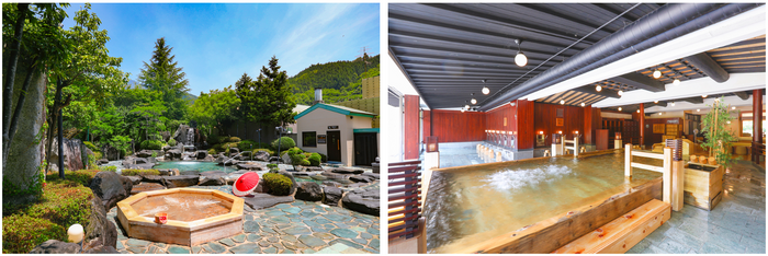 左:標高約700メートル。木曽の山並みに囲まれ、日中はどこまでも広がる空を、夜は満天の星空を楽しめる自慢の庭園露天風呂。