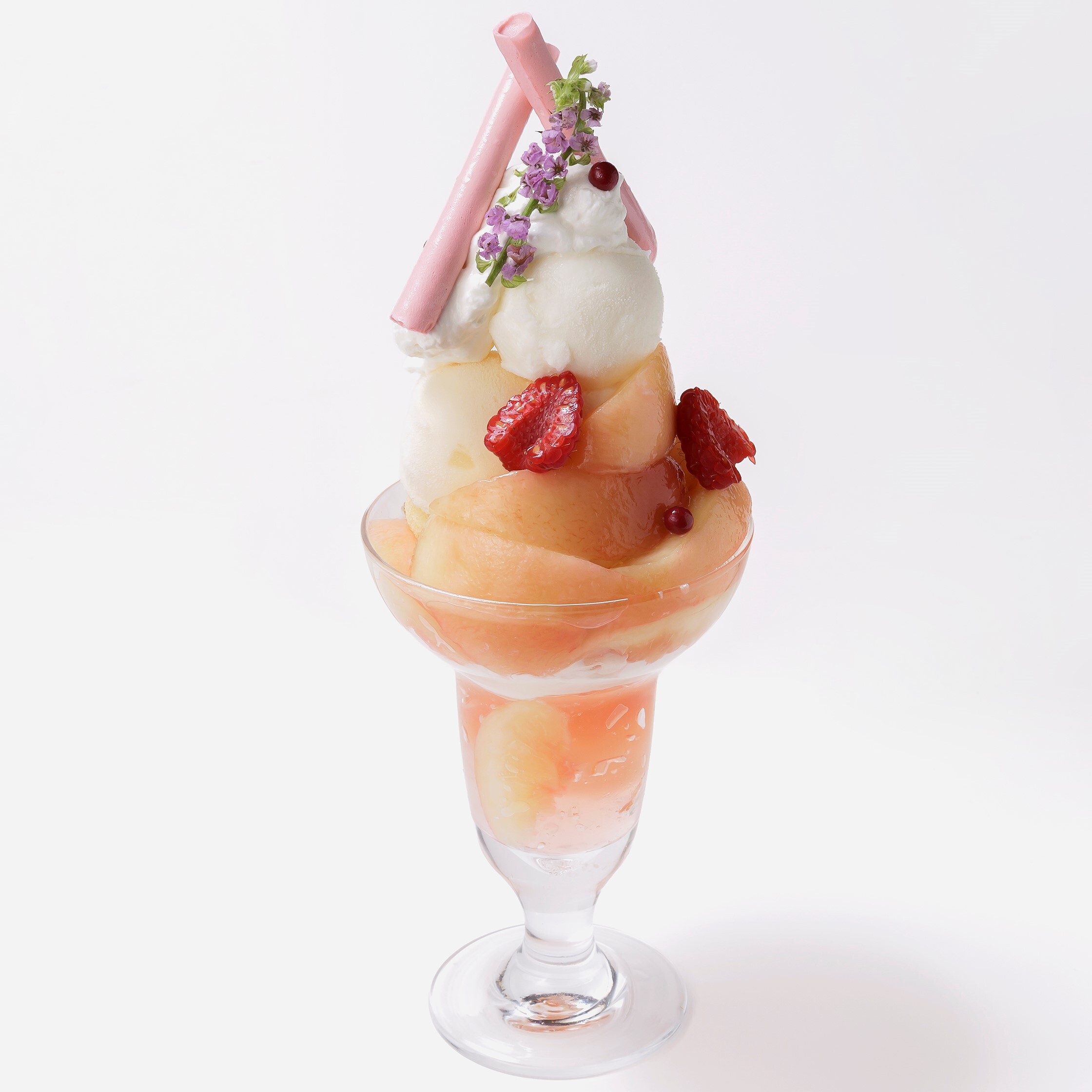 桃と相性の良いヨーグルトを組み合わせたパフェ。ヨーグルトクリームとヨーグルトソルベ、桃ソルベ、桃ゼリーなどさっぱりとした味わいです。最後まで桃を一緒に食べれるように中にも桃がたっぷりと入っています。
