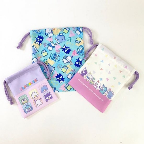 まずは、巾着袋の3pセットのご紹介。大中小サイズの3つの袋がセットになっていて、それぞれにデザインも違うんです。6人が大集合しているので、何だかお得な感じですよ。