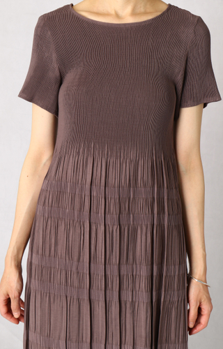 〇胸の下からは、ゴムの縮みによって生まれる、ナチュラルなボーダー柄です。デザインアクセントと着心地の良さを兼ね備えています。