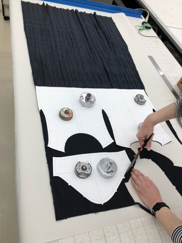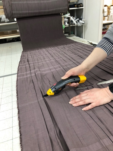 通常は機械で裁断しますが、今回の米沢織りは職人さんの手作業で仕上げています。生地の味わいや、米沢織りのふんわりと広がる性質上、重ねて裁断することが難しく、手作業で一点一点丁寧に行っています。