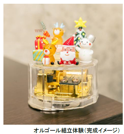 オルゴール職人のサポートのもと、自分だけの音色のオルゴール作りが体験できます。お好みの曲、ケース、コース(一般コース、上級コース)を選んで、完成したオルゴールは持ち帰りできます。心を込めて作ったオルゴールは、クリスマスプレゼントにもぴったりです。クリスマスらしい飾り付け小物(220円~)もご用意しています。