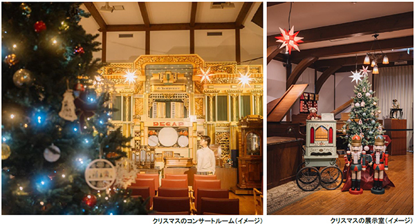ドイツを中心とした欧米のクリスマスをテーマに展示、イベントを行います。森の音ホール内コンサートルームでは、アンティーク・オルゴールなどの自動演奏楽器に囲まれた空間をクリスマスツリーやドイツ製のクリスマスオーナメントを用いた、あたたかな雰囲気の室内イルミネーションで彩ります。物語の世界のような空間で、自動演奏楽器による讃美歌やクリスマスソングを演奏するコンサートを行うほか、ドイツ製のオーナメントやクリスマスデザインのオルゴールの販売、期間限定カフェメニュー、ワークショップなど、施設全体で街中とは一味違ったクリスマスムードが楽しめます。