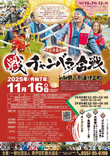 戦チャンバラ合戦 2025 in 細野高原(東伊豆町)ページ https://www.hosonokougen.com/%E6%88%A6%E3%83%81%E3%83%A3%E3%83%B3%E3%83%90%E3%83%A9%E5%90%88%E6%88%A6-2025-in-%E7%B4%B0%E9%87%8E%E9%AB%98%E5%8E%9F/