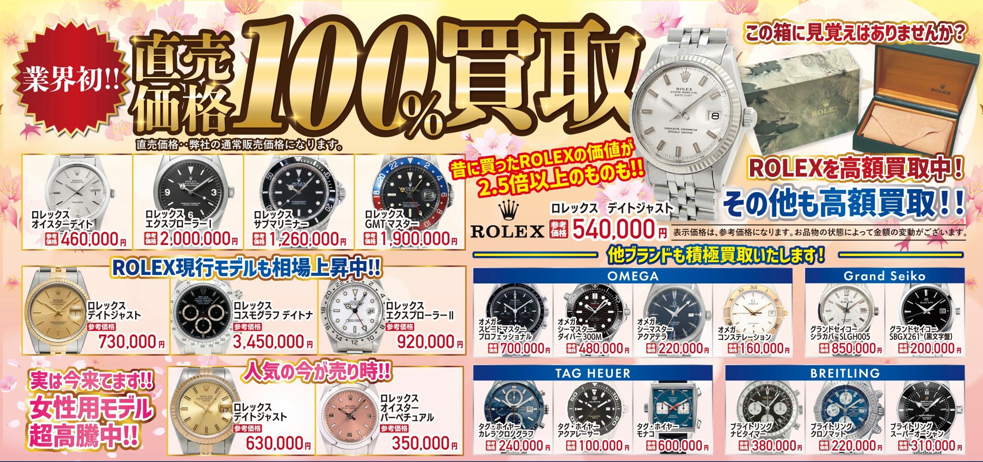 ロレックスをはじめとする高級腕時計も、直売価格100%を基準とした特別査定にてお買取りいたします。