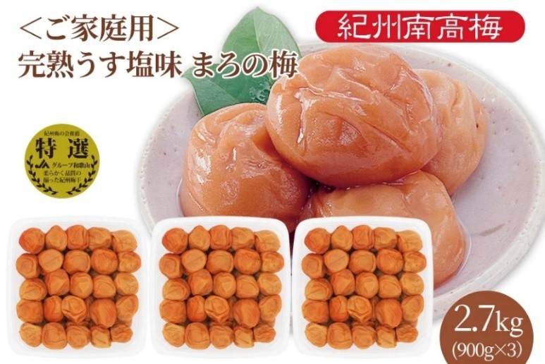 〇紀州南高梅 ご家庭用 完熟うす塩味 まろの梅 塩分7% 900g×3