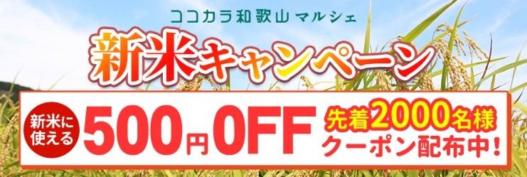 さらに、現在「新米キャンペーン」を開催中です。「ココカラ和歌山マルシェ」ショップの新米購入で使える500円OFFクーポンを先着2,000名様に配布中。対象商品が500円OFFで購入できます。