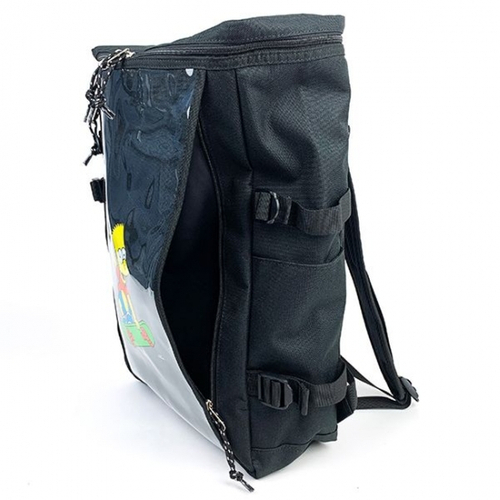 ブラックカラーのリュックは、ひと目でクールな印象♪中央には、スケボーを楽しむバートのデザインが描かれています。カラフルなバートガアクセントになってますね♪