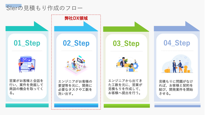 私たちはSaaSプロダクトとして、見積もり工数のナレッジシェアを促し、エンジニアの見積もり作成について効率化を図るDXツールを提供しております。クラウド上で見積もり工数データを一元管理することにより、スムーズなナレッジ共有を実現し、属人化を防ぎます。