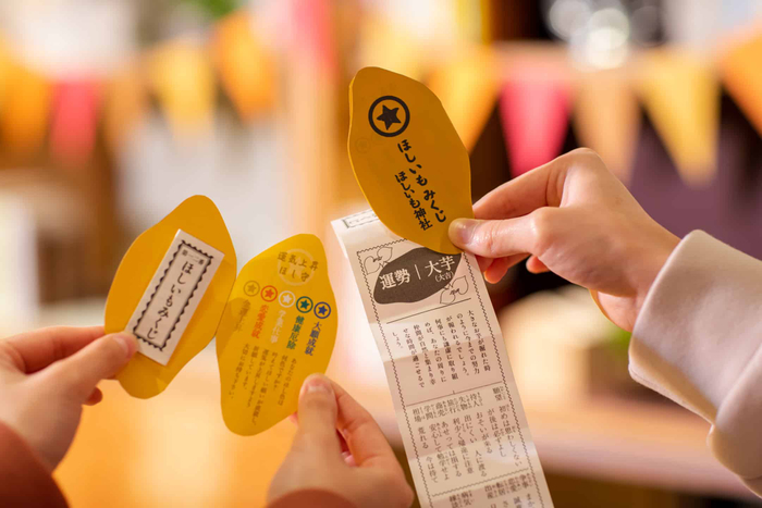 昨年に引き続き、パブリックスペース「TAMARIBA」に「ほしいも神社」の分社が登場します。「欲しいものが手に入る」というご利益があり、イベント期間中はいつでも参拝することができます。「ほしいも神社」とは、茨城県ひたちなか市に、干し芋作りを続けられるように祈念して建立された神社です。分社の境内には、干し芋の形をした絵馬や、「ほしいもみくじ」が登場。おみくじには、大芋・中芋・小芋で表現された運勢と、お告げが書かれています。