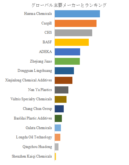 LP Informationのトップ企業研究センターによると、エポキシ化大豆油の世界的な主要製造業者には、Hairma Chemicals、Cargill、CHS、BASF、ADEKA、Zhejiang Jiaao、Xinjinlong Chemical Additives、Dongguan Lingchuang、Nan Ya Plastics、Valtris Specialty Chemicalsなどが含まれている。
