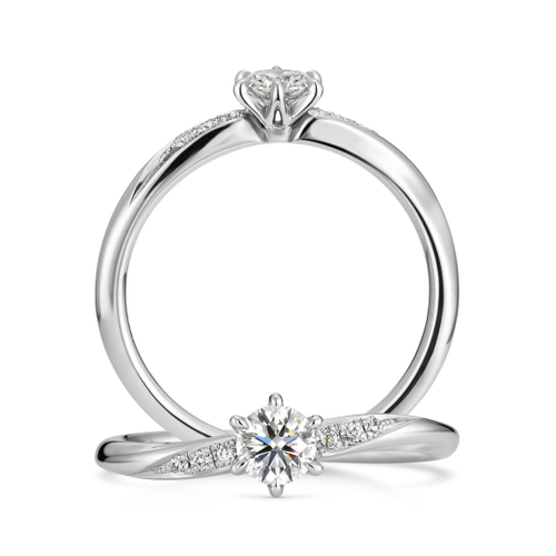 既存の人気デザイン『パーチェ』の魅力をそのままに、石座の高さを低く設計して普段使いしやすさをアップしたデザイン。メレダイヤモンドも10ピースから6ピースに調整し、主張しすぎない婚約指輪に仕上げました。右肩上がりのゆるやかなウェーブラインは、身に着けたときに小指側の付け根にもフィットするため、指を長く見せてくれる効果があります。