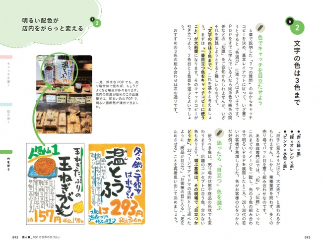 100点超えの実例をフルーカラーで掲載し、文字の書き方・イラストの描き方・色の使い方から、POPを書いたあとの効果的な活用法までを丁寧に解説しています。