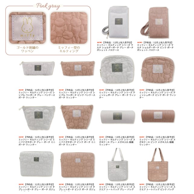 ミッフィーから、くすみ系カラーが大人っぽい素敵なアイテムのご紹介です。キルティング素材で、しかもミッフィーのフェイスの形がキュートなポーチたち。うっとりするような綺麗なカラーで秋冬にピッタリな仕上がりです。