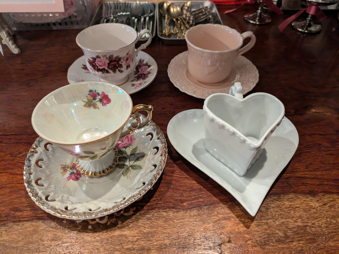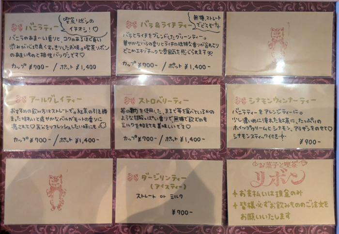店内は、猫好きの店主らしく、飼い猫をモチーフにしたロゴが特徴です。また、イギリス製の陶器の猫のポットや猫に関連するアイテムが数多く揃っており、猫好きにはたまらない空間です。さらに、店主がこだわり抜いたヴィンテージ食器の数々が、喫茶リボンの世界観を演出しています。