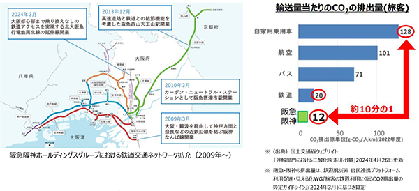 阪急阪神ホールディングスグループでは、サステナビリティ宣言において「環境保全の推進」を重要テーマの一つとして定め、地域とともに発展してきた企業グループとして、脱炭素社会の実現に向け、自らの事業活動のみならず、まち全体の環境負荷の低減を目指した取組を推し進めています。特に鉄道は、お客様一人あたりの輸送エネルギーが自動車と比べて低く、都市部に路線を持つ阪急・阪神では自動車と比較すると「約1/10」と極めて効率が高いことから、鉄道を核とした公共交通ネットワークを構築することで脱炭素社会に向けたまちづくりに貢献できると考え、公共交通ネットワークの拡充を通じた環境負荷の低減に取り組んでいます。