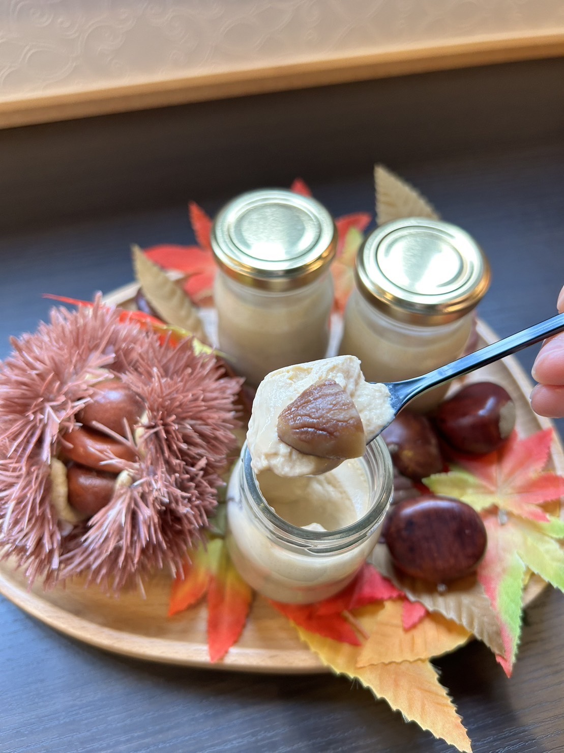 この度、当店では栗を使った新商品「マロンプリン」を2023年11月より販売開始いたしました。今回使用する栗は、繊細かつ上品な甘み、高貴なかぐわしい香り、ホクホクとした食感など、この季節ならではの旬の味わいで、人々を魅了する美味しさを持っております。そんなこの時期ならではの栗を使って、マロンプリンを開発いたしました。