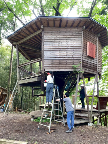 豊田市の森で進められている、名城大学理工学部のサークル「木造建築研究会」の学生たちも加わったツリーハウス造りが、2023年夏に完成した。そして今付属屋であるバイオトイレ棟を建設中だ。場所は同市東萩平町の安藤征夫さん所有の裏山。周囲には丸太の滑り台、巨木につるされたブランコ、40mのロープスライダーもある。