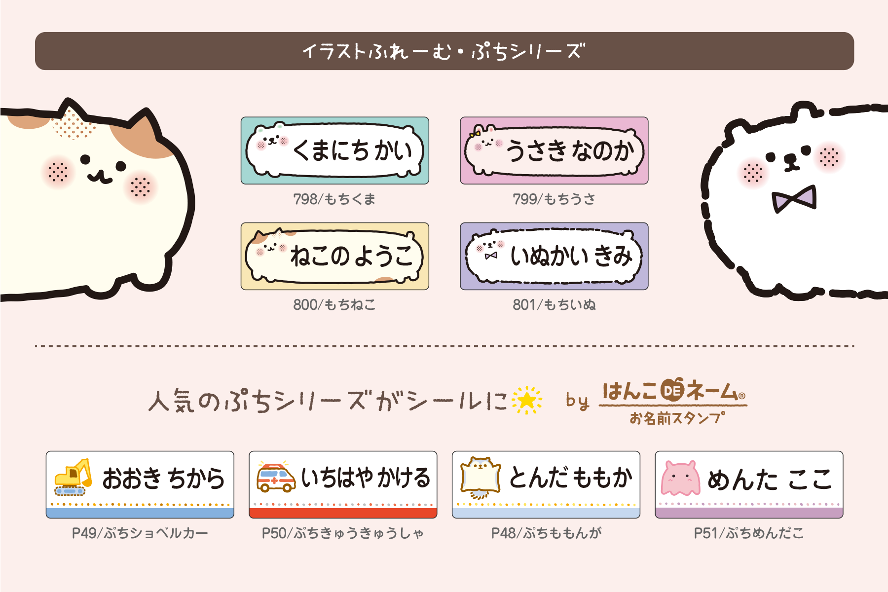 当店人気の「ぷちシリーズ」でお名前シールのMIXだけで販売していた、ショベルカーと救急車が「単独で欲しい!」というご要望があり、単体デザインとして仲間入り。さらに“モモンガ”と“めんだこ”も加わって、ぷちシリーズが全51種類となりました。