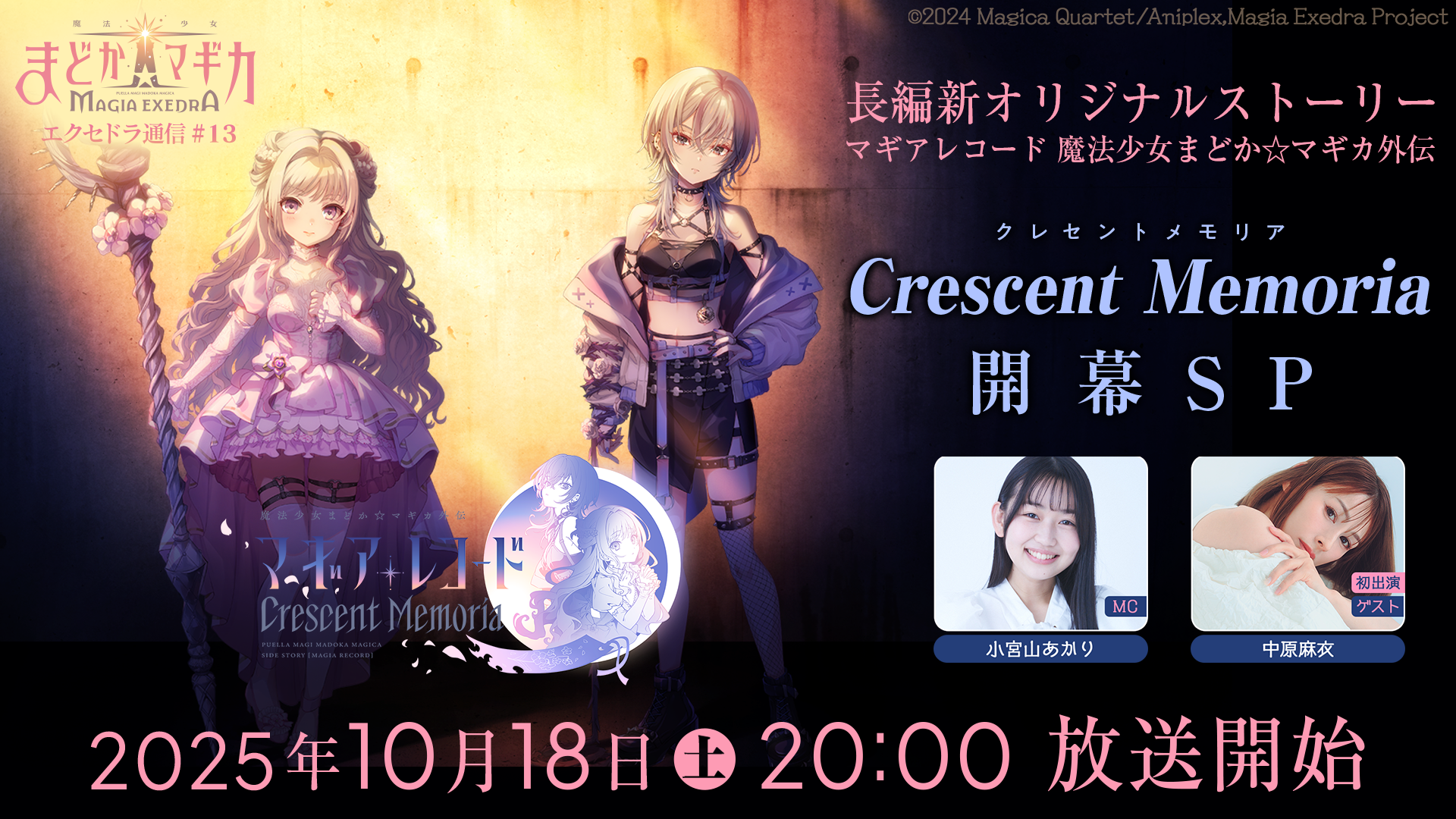 株式会社アニプレックス(本社:東京都千代田区 代表取締役 岩上敦宏 以下アニプレックス)は、『魔法少女まどか☆マギカ Magia Exedra』(Magia Exedra:マギアエクセドラ)の公式番組「魔法少女まどか☆マギカ Magia Exedra エクセドラ通信#13 長編新オリジナルストーリー マギアレコード 魔法少女まどか☆マギカ外伝 Crescent Memoria 開幕SP」を10月18日(土)20時より生配信することを決定いたしました。