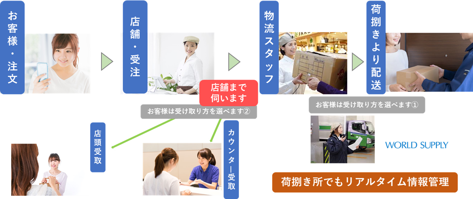 商品情報の連携等は常時データにて行われます。注文確定後には、館内を巡回しているワールドサプライ社の物流専属スタッフが商品をテナントの店頭まで受け取りに行きます。伝票記入の手間などを軽減することで、専門店の店頭在庫販売に集中できる体制を構築し、配送に至るまでをシステムにて対応します。