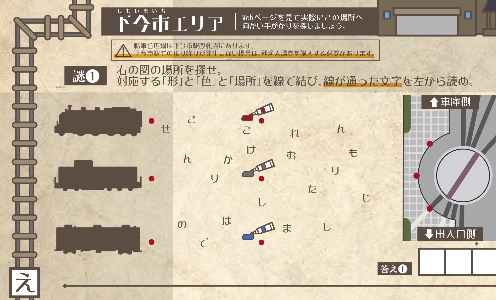 浅草駅や下今市駅などのフリーペーパー配布場所に設置されたラックから、「なぞときマップ」を入手することで参加できます。「なぞときマップ」内の「遊び方」を読み、「下今市」「大谷向」「小佐越」「鬼怒川温泉」の4つの駅から始めたい駅を選び、ゲームをスタートします。各エリアには2ヶ所ずつ謎解きスポットを用意しており、2つの謎を解くと「まとめの謎」が解放されます。4つのエリア全ての「まとめの謎」を解き、裏表紙の二次元コードから遷移できる専用のゲームページにて、最後の謎に正解するとゲームクリアです。