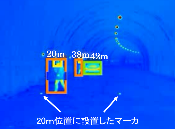 光源のない夜間や薄暗い環境下でも人物が検出できるセンサを戸田建設とともに検討を進め、熱を検知できる遠赤外線カメラを採用することにしました。トンネル工事で撮影した画像と当社独自のディープニューラルネットワーク(DNN)技術を用いることで97%以上の精度で人物を検知でき、人物までの距離を高精度(測定距離10mに対して1%程度の誤差)に推定することが可能となりました。(図2.3)。また、カメラから至近距離で足元が写らない人物についても当社独自のDNN技術を用いることで検知可能となりました。