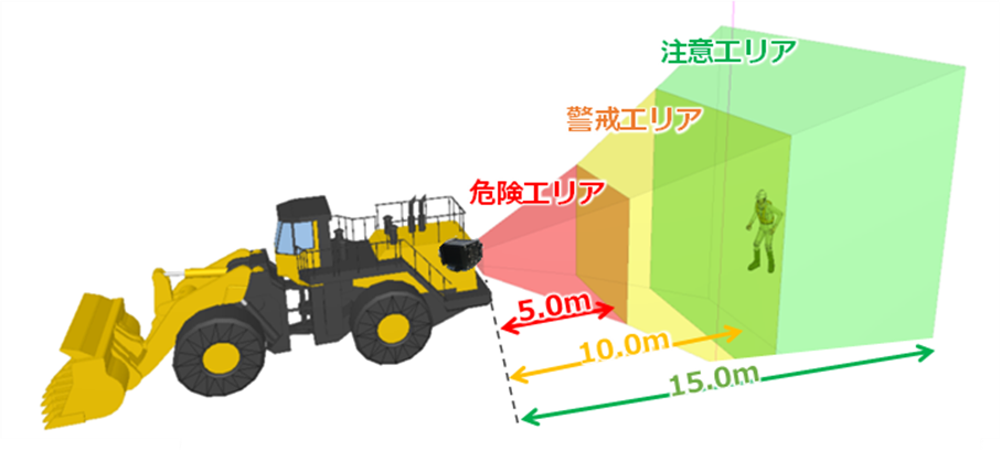 本システムは建機に設置したカメラから検出人物(作業員)までの距離に応じて、警報エリアを任意に設定することが求められていました。そこで、「画像認識エッジソリューション」を用いて取得できるカメラと人物の距離に応じた警報エリアを3段階(危険エリア:0-5m以内、警戒エリア:5-10m以内、注意エリア:10m~15m以内)に設定し、建機オペレーターに対し各段階(危険エリア:赤ランプ+ブザー音、警戒エリア:黄色ランプ、注意エリア:緑ランプ)に応じた警報を通知するアプリケーションの開発を行いました。この結果、建設現場での作業員の安全を支援することが可能になりました。