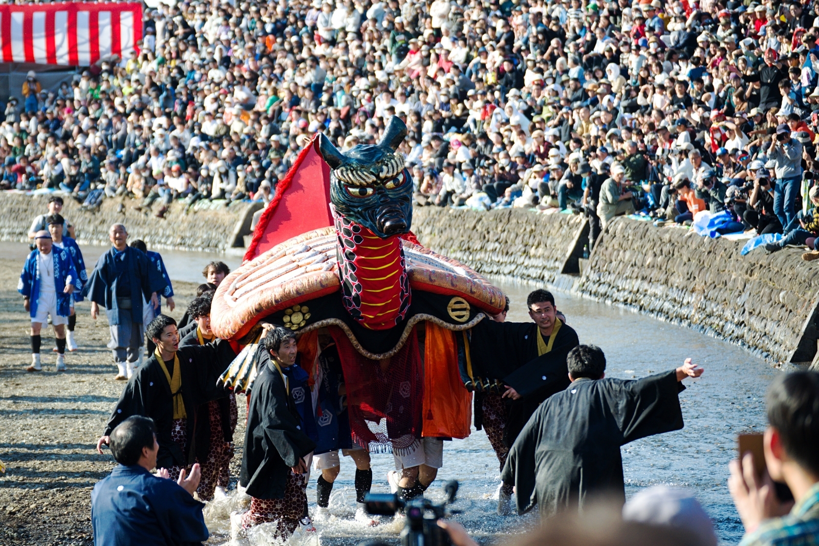 砥崎河原で激しく舞う、長さ3m、高さ2.5mの巨大な「ガメ」!およそ1300年前、妙見神(みょうけんしん)が中国から海を渡ってくる時に乗ってきたとされる亀と蛇が合体した神獣「亀蛇(きだ)」。地元の人からは「ガメ」の愛称で親しまれている亀蛇は、100キロ以上の重さがあり、担ぎ手が5人1組で息を合わせ、首を上下左右に振りながら会場を駆け回ります。
