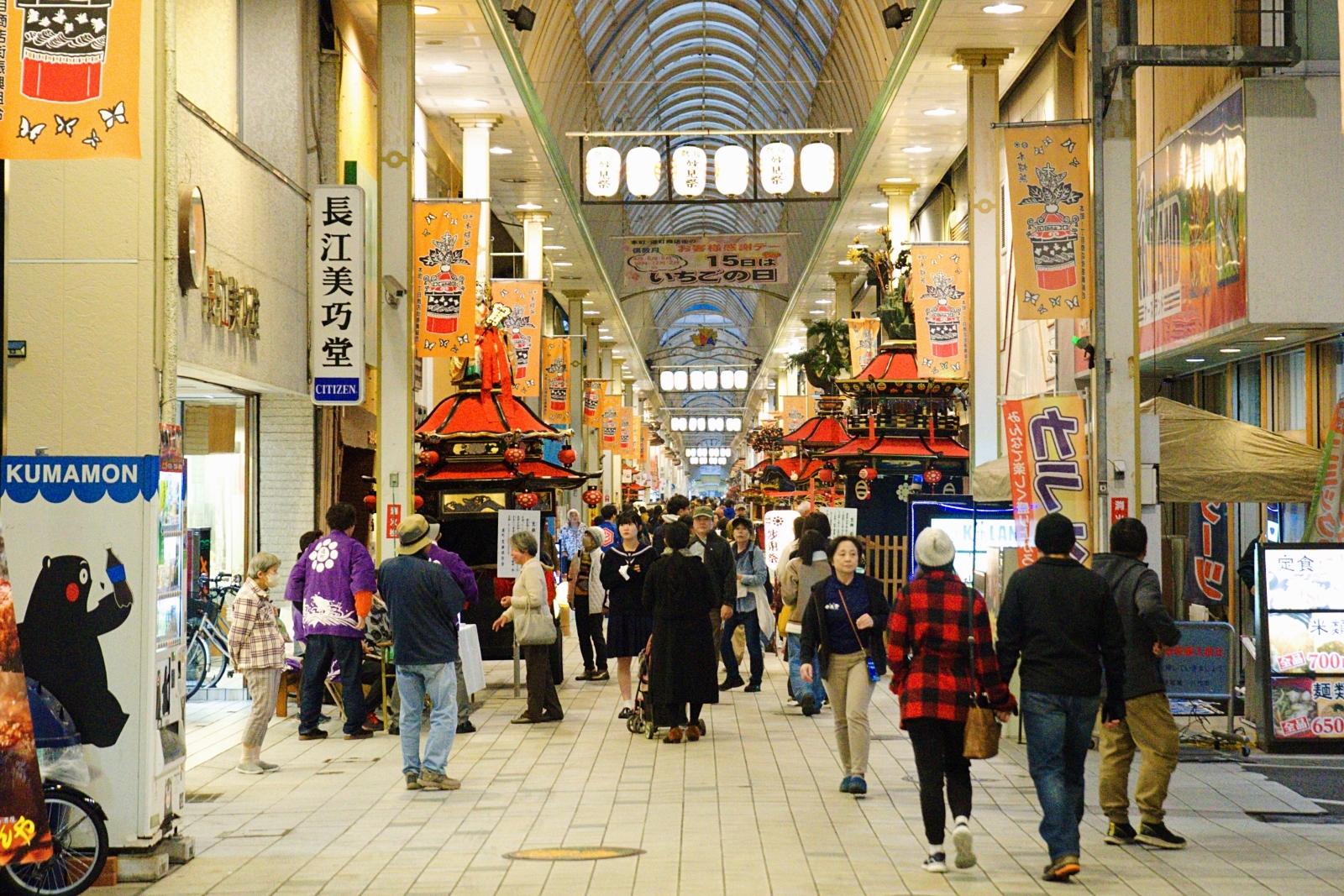 八代妙見祭の前夜祭にあたる「御夜」では、奉納出し物展示やステージパフォーマンスでお祭りを盛り上げます。中心商店街となる本町アーケードに笠鉾や亀蛇などがズラリと展示されるほか、地元の秀岳館高校の和太鼓の演奏や、伝統芸能フェスティバルとして島根県の「石見神楽」、鹿本農業高校の「山鹿灯籠踊り」も登場!翌日の本祭に向けた機運を高めるイベントが目白押しとなっています。
