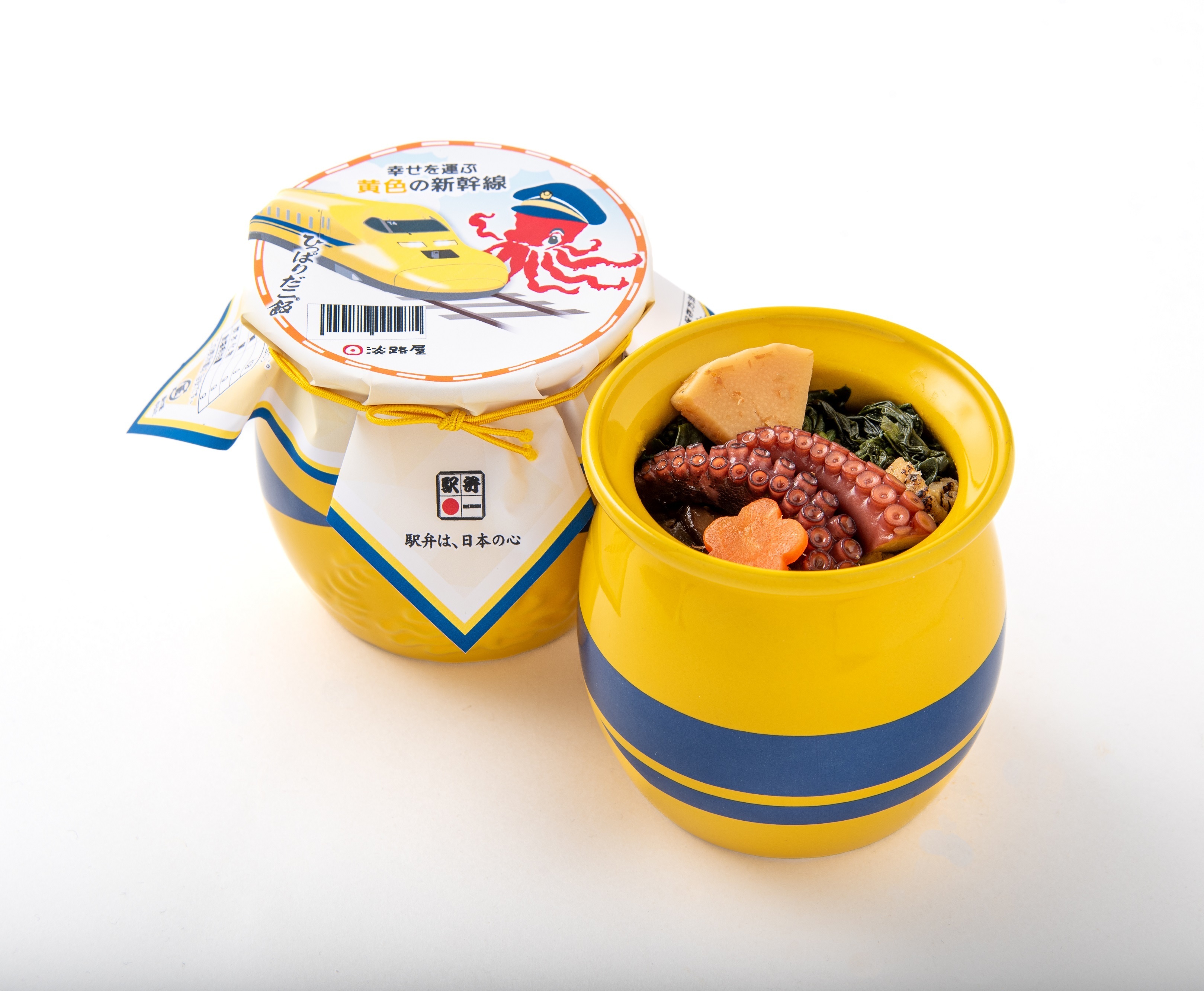 ドクターイエロー(T4編成)の引退にあわせて、関西地区を代表する駅弁「ひっぱりだこ飯」がオリジナル仕様になって登場。ドクターイエローを想起させるデザインに仕上げた蛸壺や、車両と戯れる蛸の姿を描いたオリジナルの掛け紙が特徴です。