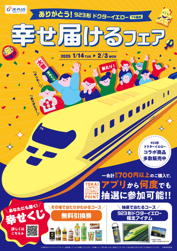 株式会社JR東海リテイリング・プラス(所在地:愛知県名古屋市、代表取締役社長:小林 創)は、2025年1月にJR東海が保有する「ドクターイエロー(T4編成)」が運行を終えることから、1月14日(火)より『ありがとう!923形ドクターイエロー(T4編成)幸せ届けるフェア』を開催いたします。
