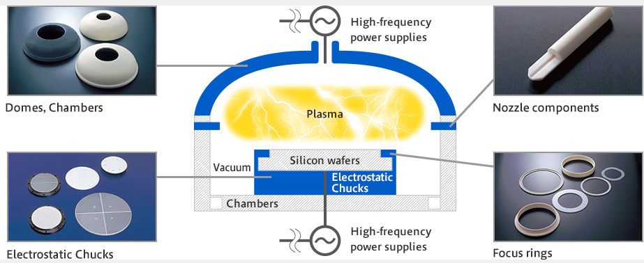 材料体系としては、高純度酸化物系セラミックスであるアルミナ、イットリア、ジルコニアおよびZTAなどに加え、窒化アルミニウム、炭化ケイ素、窒化ケイ素、窒化ホウ素やPBNなどの非酸化物系が主要を成し、高純度粉体を起点に、成形、焼結や熱圧、CVDを経て、精密加工、超純洗浄、必要に応じたコーティングや修復までを一連の工程として工業的に供給される。近年は先端ノード化とプラズマ環境の苛酷化により、より高い耐食性と低発塵を両立する材料とコーティングの採用が加速し、例えばY2O3やYOF系の被膜、緻密化プロセスの重要性が増している。同時に熱管理と高温プロセスの高度化を背景として、窒化アルミニウムなど高熱伝導セラミックスを用いた加熱・支持部材の適用範囲も拡大する方向にある。