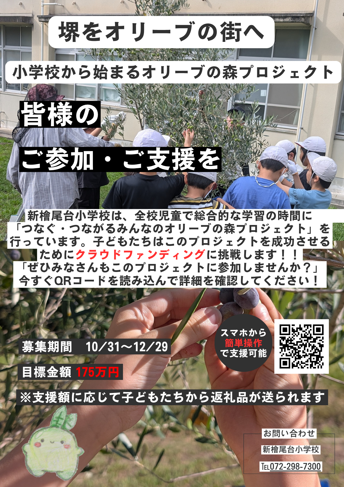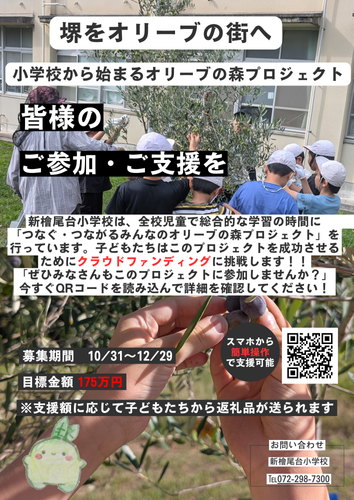 堺市立新檜尾台小学校(所在地:大阪府堺市南区新檜尾台3丁7番1号、代表:古谷俊之校長)は、児童が主体となってクラウドファンディングに挑戦する「新檜尾台小学校~つなぐ・つながるみんなのオリーブの森~プロジェクト」を開始しました。目標金額175万円の達成に向け、2025年12月29日まで支援を募集しています。