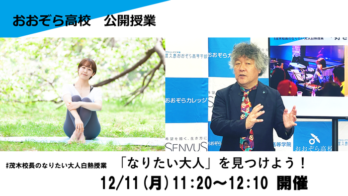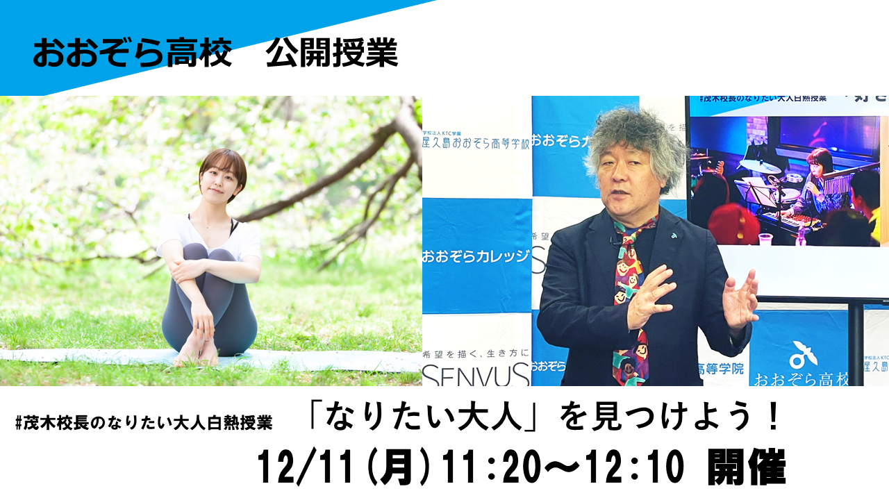 屋久島おおぞら高等学校 茂木健一郎校長による#なりたい大人白熱授業、12月の公開授業のお知らせです。今回のゲストは、千葉県出身2016年おおぞら高校柏キャンパスを卒業。卒業後は、東京スポーツレクリエーション専門学校こども保育スポーツ科に進学。卒業後は都内幼稚園で3年勤務ののち、フリーランスで幼児体育指導を行う。現在は『セルフラブ』を軸に、ヨガインストラクター・専門学校講師として活動している福井 巴菜さんです。