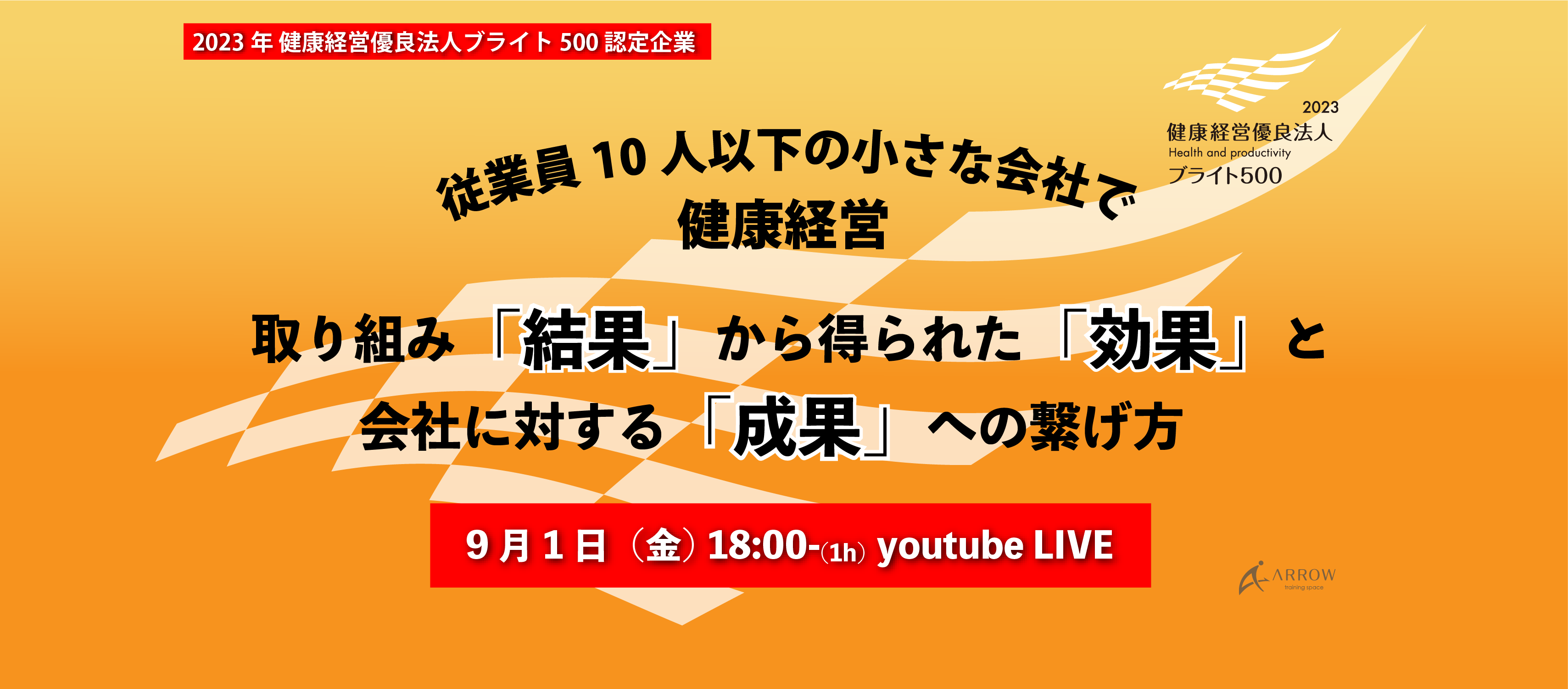 理学療法士による、インフォーマルサービスの提供を行う株式会社アロー(本社:東京都世田谷区、代表取締役:阿藤 貴史、以下 アロー)は、2023年9月1日に、小規模事業者向けオンラインイベント「従業員10人以下の小さな会社で健康経営~取り組み「結果」から得られた「効果」と会社に対する「成果」への繋げ方~」をYouTubeのライブ配信にて開催いたしました。