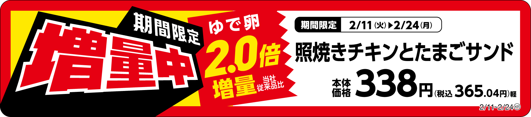 14日間限定増量中!ゆで卵2.0倍増量※1 「照焼きチキンとたまごサンド」 2月11日(火)~2月24日(月)実施