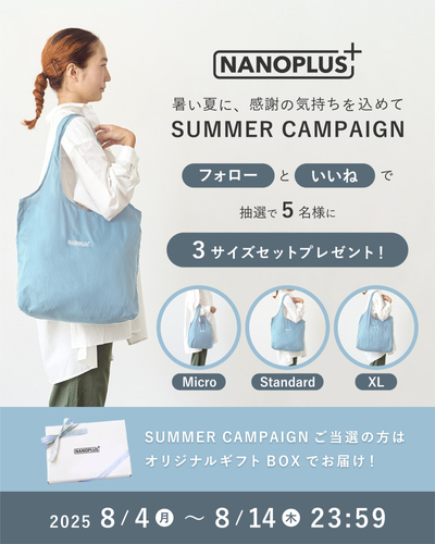 幅広いシーンで使用いただいているエコバッグ「NANOPLUS 」。暑い季節に少しでも快適なお出かけをサポートしたいという思いから、日常使いはもちろん、旅行やアウトドアにも便利な3サイズを揃えてお届けするキャンペーンを開催いたします。